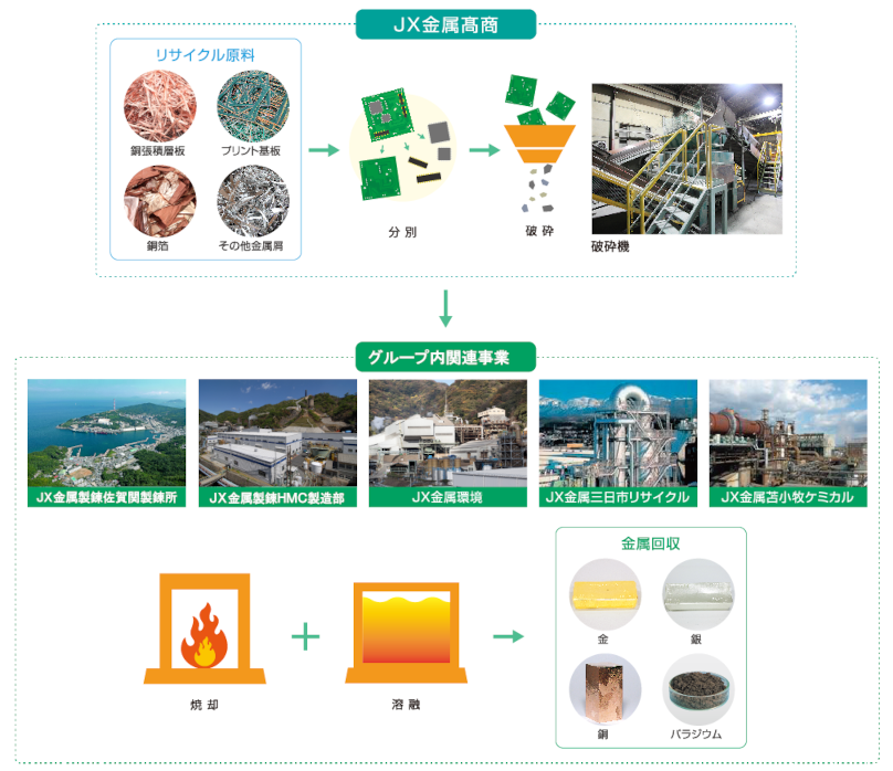 金、銀、銅、プラチナなどの有価金属が回収され、JX金属グループをはじめ、幅広い事業所に原料供給されます。