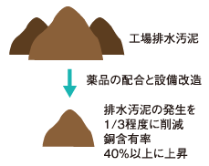 設備メーカーの協力のもと、排水工程で使用する薬品の配合と設備改造を行い、汚泥の発生量を減らし、含まれる銅含有割合を改善して有価物化を提案。 |