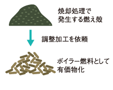 燃え殻に残っているカロリーを利用し、炭化燃料としての活用を提案。排出事業者にはボイラー燃料として使用可能なレベルに調整加工の協力を依頼。 |